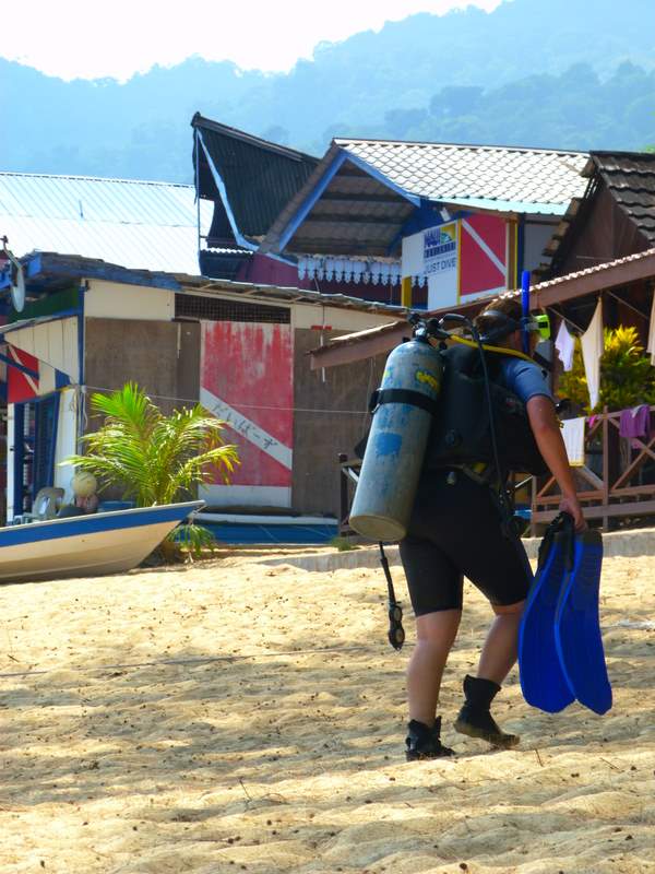 The next morning was an early start off to the east coast as Jan was starting her scuba dive course to get Open Water certified. She was a bit nervous and we arrived in good time to meet her dive instructor, Sammy before we left to go and have a walk through Tekek – the main town of the island. It was hot. Really hot. So the three of us spent a large amount of time over lunch and consumed rather a lot of watermelon juice. We then paddled (for those without duct-taped feet) and sunbathed for the rest of us. Jan came back later in the afternoon and had loved the diving (apart from a couple of skills – she claimed she just had too small a nose to clear a mask in one go) and we (surprise surprise) had more noodles and a quick game of humming (don’t ask).