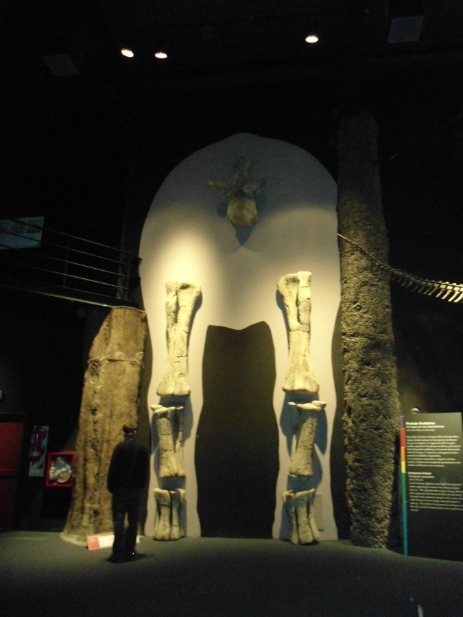 A replica of a dinossaur with the enormous leg bones found around Trelew