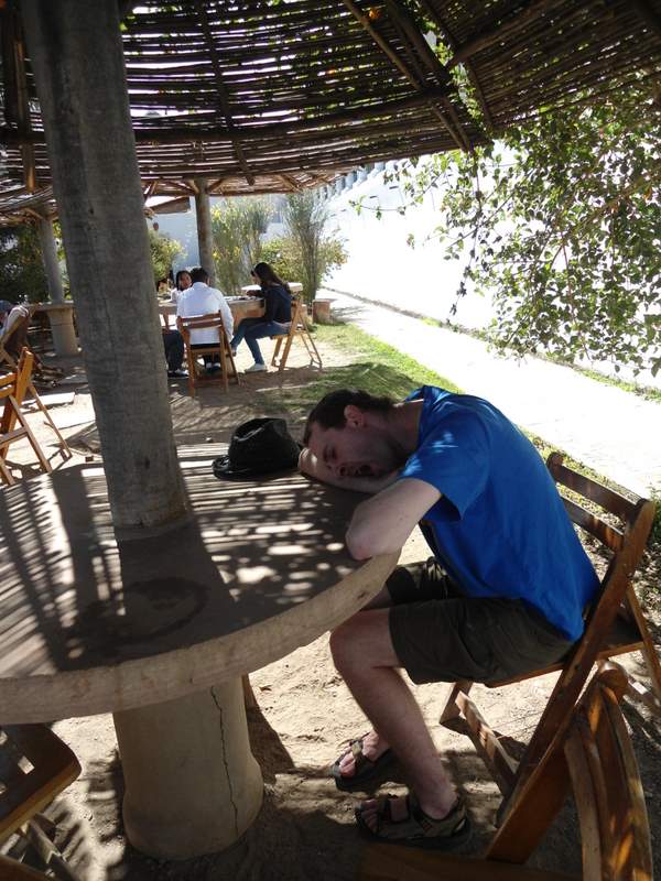James falling asleep at breakfast in Sucre after a hellish 17 hour bus journey