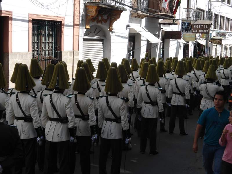 A marching brigade getting ready for their big entrance into the 25 de Mayo celebrations in a side street, Sucre