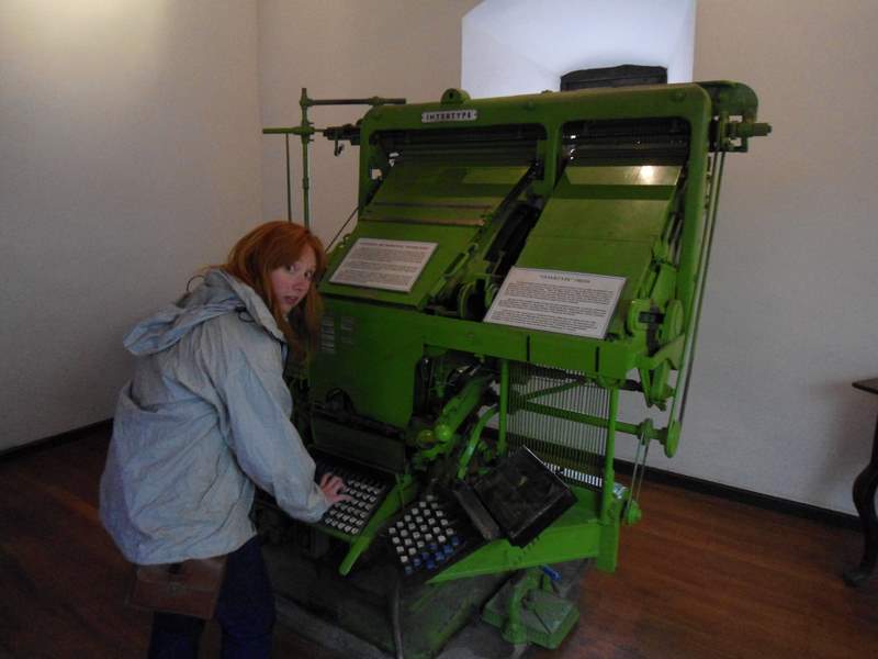 Claire “typing” on an old style typewriter in the Casa de Moneda museum, Potosi