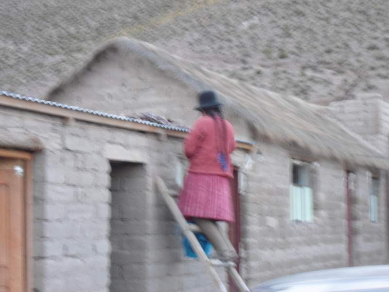 A lady picking the drying llama meat off the roof of our room