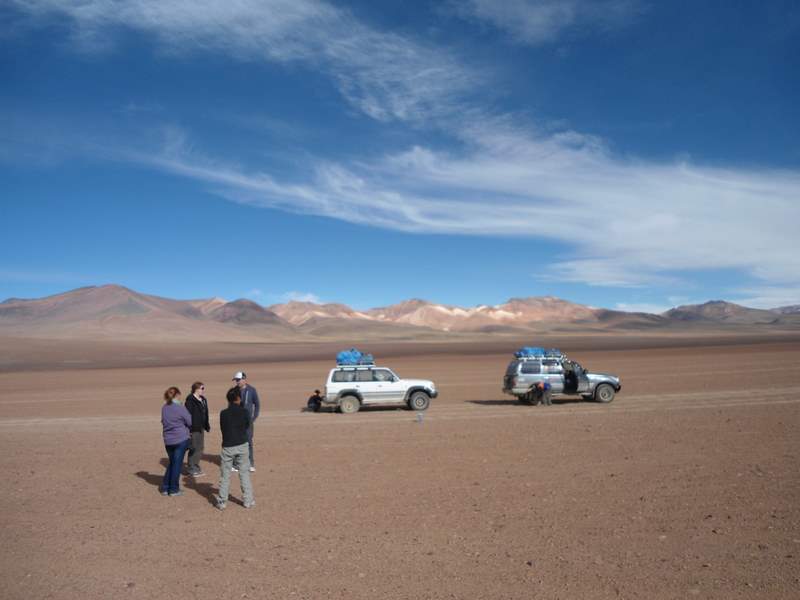 Us standing at the foot of the volacnoes that mark the frontier to Chile