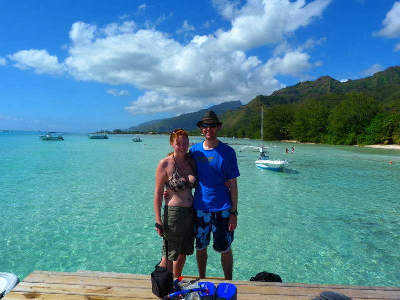Us on the jetty on the north of Moorea waiting for our water taxi to one of the Motus
