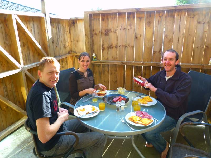 Having bacon & eggs with Jono and Kate at Hahei