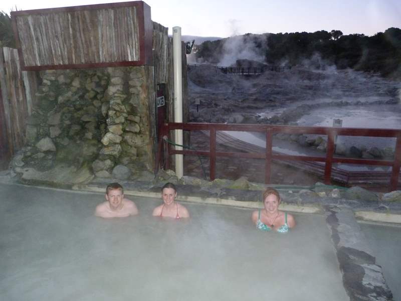 Jono, Kate & Claire enjoy the thermal waters at dusk after a mud bath