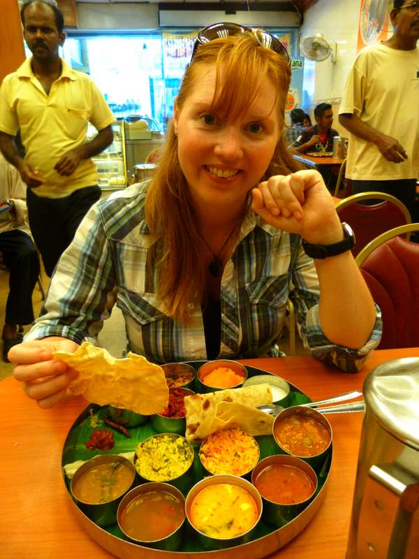 Claire getting stuck into yet another amazing meal in Little India, Kuala Lumpur