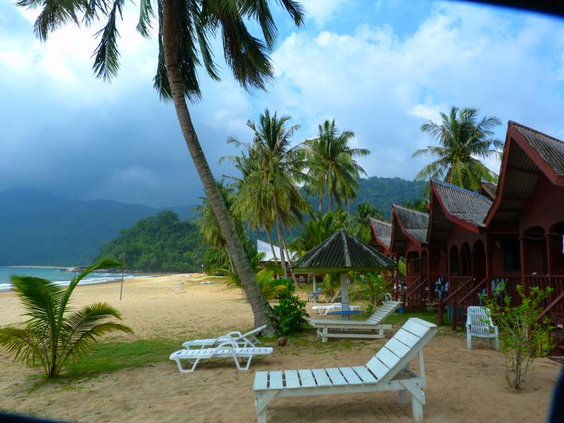 Lexi, Janet and James reading Jan's guardian at our bangalow, Juara